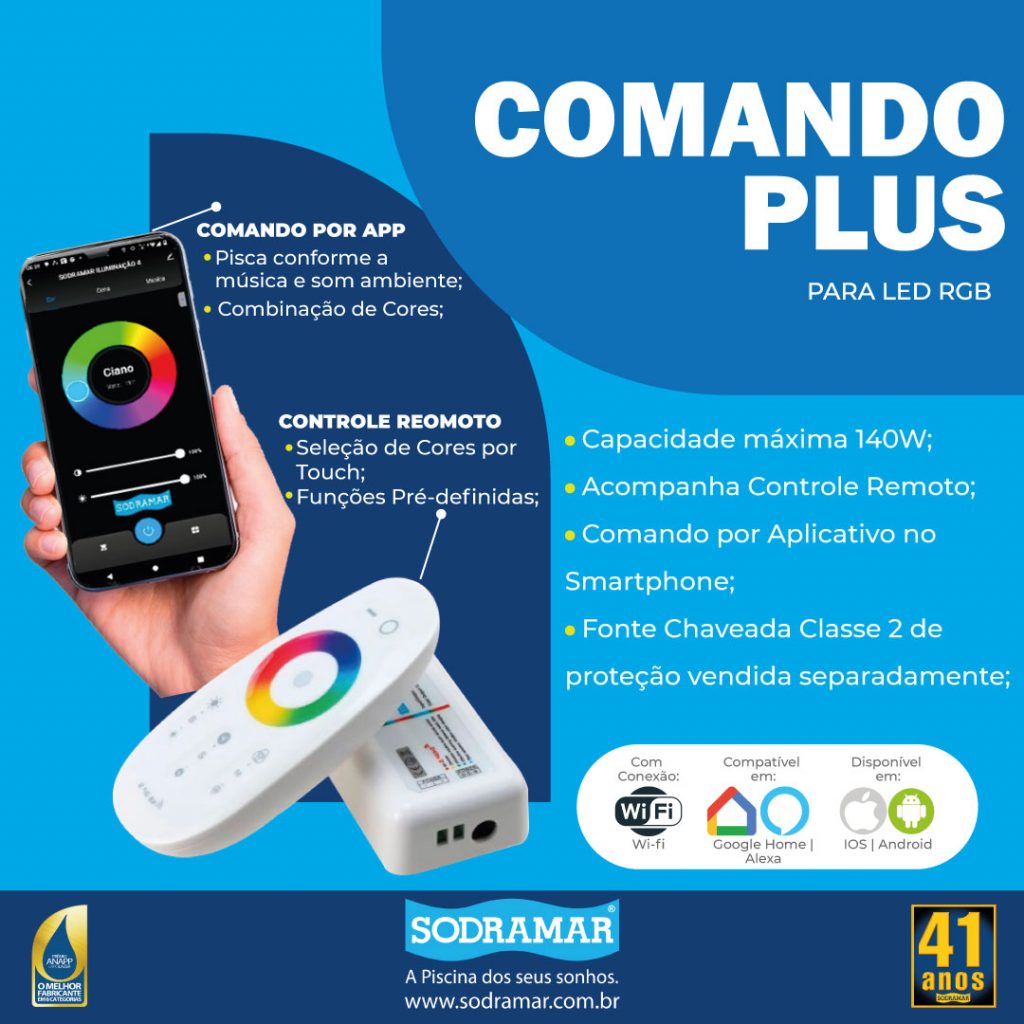 O módulo de Comando Plus Sodramar conta com a acessibilidade do Wi-Fi, que permite conexão com o celular através do sinal Wi-Fi. Possui opções de trocar as cores da iluminação da piscina, escolher entre uma das várias programações pré-definidas ou escolher a função musical, onde os led’s acompanham e piscam de acordo com uma música, também é possível selecionar a cor do LED utilizando a câmera do celular, apontando para uma cor que deseja atingir a tonalidade.
