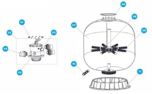 A função deste componente é possibilitar a seleção das 06 operações dispostas no filtro: filtrar, pré-filtrar, drenar, retrolavar, recircular e fechar. Os filtros FVP-100, FVP-120 e FVP-140 acompanham uma válvula de 2.1/2″. Todas as válvulas dos filtros FVP -100/120 e 140 saem de fábrica com 3 uniões de 2.1/2″ (ou adaptação para 2″) para facilitar a ligação hidráulica do filtro (válvula) com as bombas hidráulicas